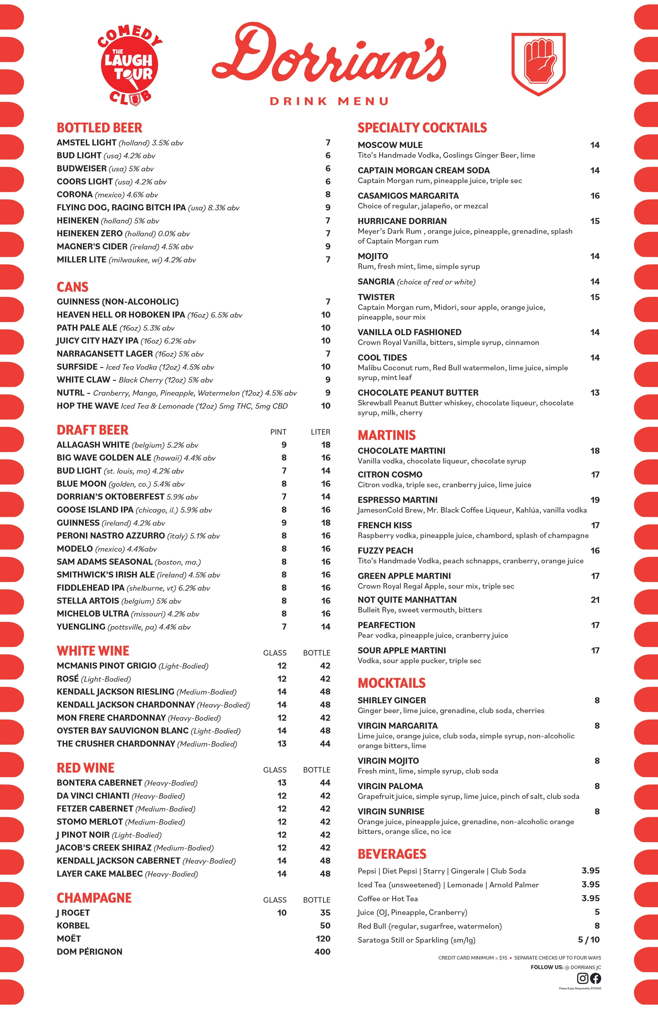 Dinner & Drinks available during show2 item minimum per person - food or drink - 20% gratuity automatically added